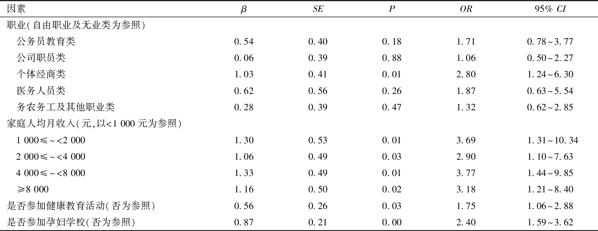 因素βSEPOR95% CI职业(自由职业及无业类为参照) 公务员教育类0.540.400.181.710.78~3.77 公司职员类0.060.390.881.060.50~2.27 个体经商类1.030.410.012.801.24~6.30 医务人员类0.620.560.261.870.63~5.54 务农务工及其他职业类0.280.390.471.320.62~2.85家庭人均月收入(元,以<1 000元为参照) 1 000≤~<2 0001.300.530.013.691.31~10.34 2 000≤~<4 0001.060.490.032.901.10~7.63 4 000≤~<8 0001.330.490.013.771.44~9.85 ≥8 0001.160.500.023.181.21~8.40是否参加健康教育活动(否为参照)0.560.260.031.751.06~2.88是否参加孕妇学校(否为参照)0.870.210.002.401.59~3.62
