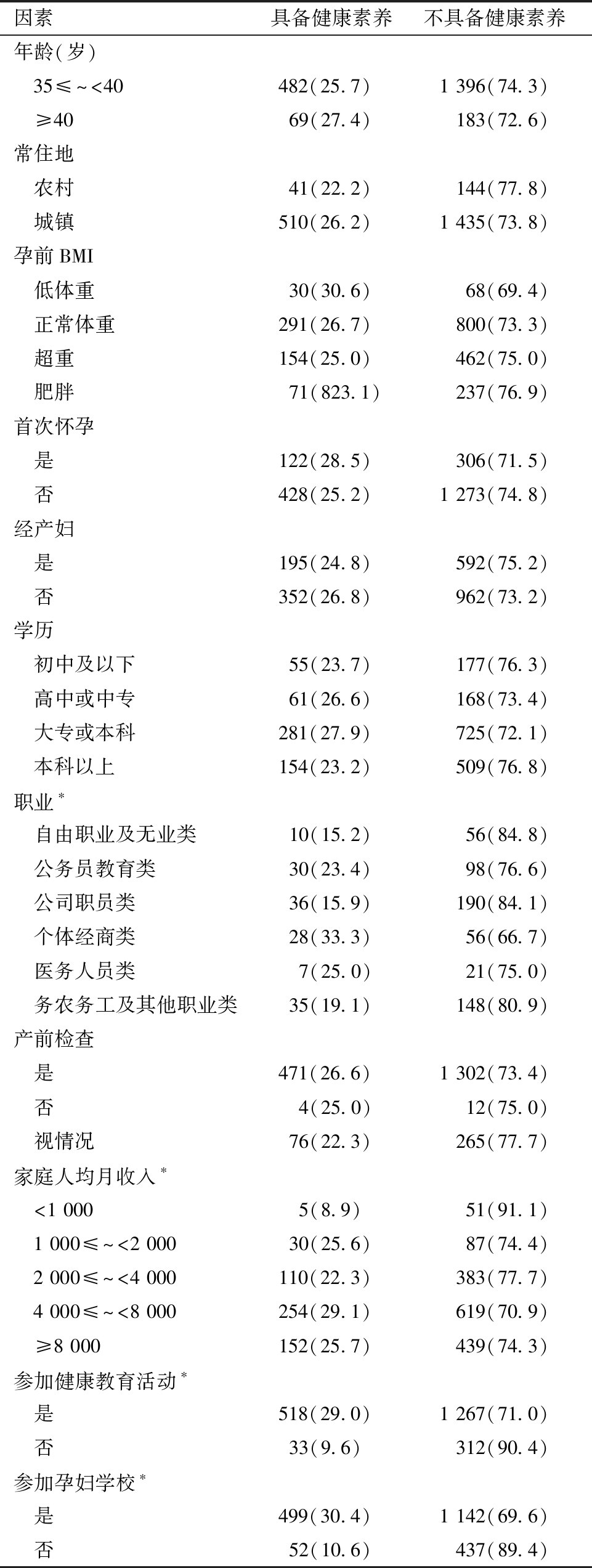 因素具备健康素养不具备健康素养年龄(岁) 35≤~<40482(25.7)1 396(74.3) ≥4069(27.4)183(72.6)常住地 农村41(22.2)144(77.8) 城镇510(26.2)1 435(73.8)孕前BMI 低体重30(30.6)68(69.4) 正常体重291(26.7)800(73.3) 超重154(25.0)462(75.0) 肥胖71(823.1)237(76.9)首次怀孕 是122(28.5)306(71.5) 否428(25.2)1 273(74.8)经产妇 是195(24.8)592(75.2) 否352(26.8)962(73.2)学历 初中及以下55(23.7)177(76.3) 高中或中专61(26.6)168(73.4) 大专或本科281(27.9)725(72.1) 本科以上154(23.2)509(76.8)职业∗ 自由职业及无业类10(15.2)56(84.8) 公务员教育类30(23.4)98(76.6) 公司职员类36(15.9)190(84.1) 个体经商类28(33.3)56(66.7) 医务人员类 7(25.0)21(75.0) 务农务工及其他职业类35(19.1)148(80.9)产前检查 是471(26.6)1 302(73.4) 否 4(25.0)12(75.0) 视情况76(22.3)265(77.7)家庭人均月收入∗ <1 000 5(8.9)51(91.1) 1 000≤~<2 00030(25.6)87(74.4) 2 000≤~<4 000110(22.3)383(77.7) 4 000≤~<8 000254(29.1)619(70.9) ≥8 000152(25.7)439(74.3)参加健康教育活动∗ 是518(29.0)1 267(71.0) 否33(9.6)312(90.4)参加孕妇学校∗ 是499(30.4)1 142(69.6) 否52(10.6)437(89.4)