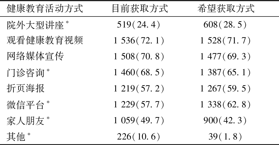 健康教育活动方式目前获取方式希望获取方式院外大型讲座∗519(24.4)608(28.5)观看健康教育视频1 536(72.1)1 528(71.7)网络媒体宣传1 508(70.8)1 477(69.3)门诊咨询∗1 460(68.5)1 387(65.1)折页海报1 219(57.2)1 267(59.5)微信平台∗1 229(57.7)1 338(62.8)家人朋友∗1 059(49.7)900(42.3)其他∗226(10.6)39(1.8)