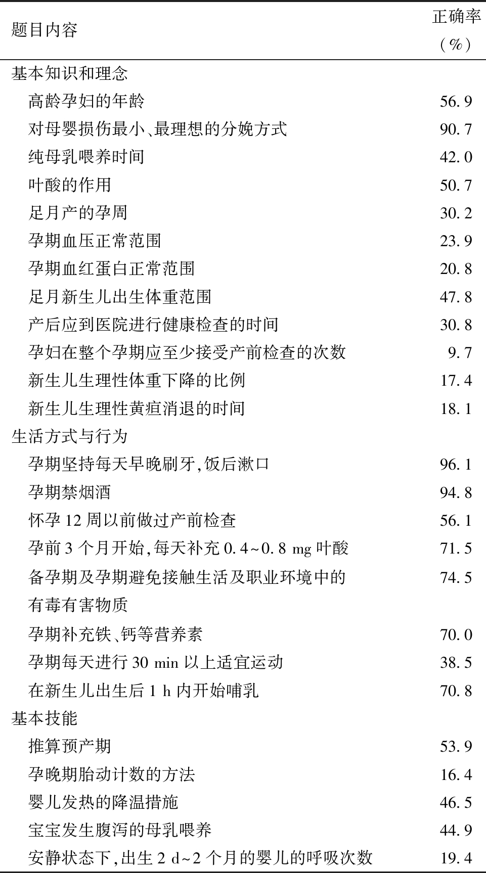 题目内容正确率(%)基本知识和理念 高龄孕妇的年龄56.9 对母婴损伤最小、最理想的分娩方式90.7 纯母乳喂养时间42.0 叶酸的作用50.7 足月产的孕周30.2 孕期血压正常范围23.9 孕期血红蛋白正常范围20.8 足月新生儿出生体重范围47.8 产后应到医院进行健康检查的时间30.8 孕妇在整个孕期应至少接受产前检查的次数9.7 新生儿生理性体重下降的比例17.4 新生儿生理性黄疸消退的时间18.1生活方式与行为 孕期坚持每天早晚刷牙,饭后漱口96.1 孕期禁烟酒94.8 怀孕12周以前做过产前检查56.1 孕前3个月开始,每天补充0.4~0.8 mg叶酸71.5 备孕期及孕期避免接触生活及职业环境中的 有毒有害物质74.5 孕期补充铁、钙等营养素70.0 孕期每天进行30 min以上适宜运动38.5 在新生儿出生后1 h内开始哺乳70.8基本技能 推算预产期53.9 孕晚期胎动计数的方法16.4 婴儿发热的降温措施46.5 宝宝发生腹泻的母乳喂养44.9 安静状态下,出生2 d~2个月的婴儿的呼吸次数19.4