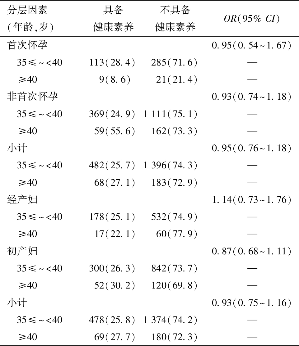 分层因素(年龄,岁)具备健康素养不具备健康素养OR(95% CI)首次怀孕0.95(0.54~1.67) 35≤~<40113(28.4)285(71.6)— ≥40 9(8.6)21(21.4)—非首次怀孕0.93(0.74~1.18) 35≤~<40369(24.9)1 111(75.1)— ≥4059(55.6)162(73.3)—小计0.95(0.76~1.18) 35≤~<40482(25.7)1 396(74.3)— ≥4068(27.1)183(72.9)—经产妇1.14(0.73~1.76) 35≤~<40178(25.1)532(74.9)— ≥4017(22.1)60(77.9)—初产妇0.87(0.68~1.11) 35≤~<40300(26.3)842(73.7)— ≥4052(30.2)120(69.8)—小计0.93(0.75~1.16) 35≤~<40478(25.8)1 374(74.2)— ≥4069(27.7)180(72.3)—