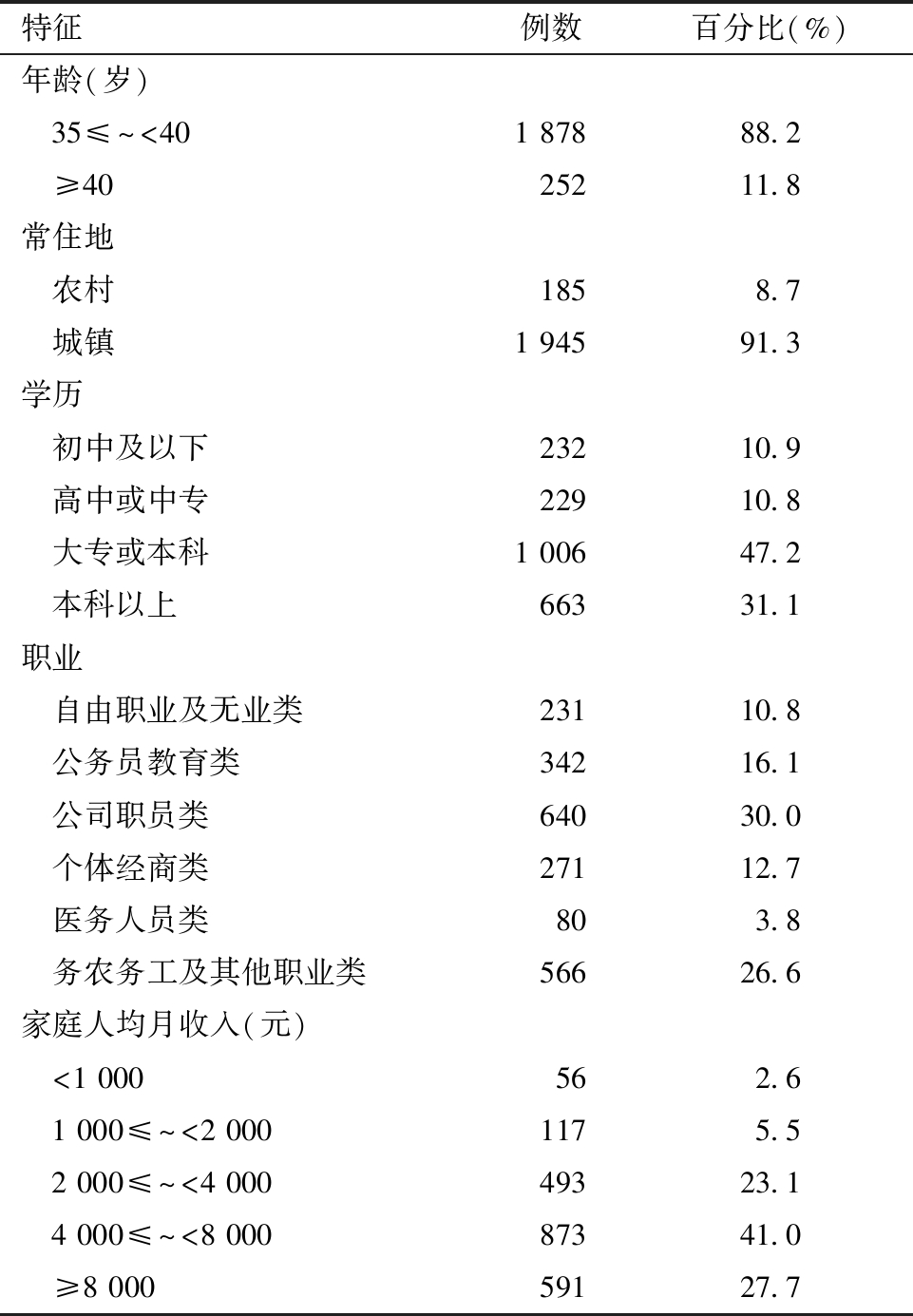 特征例数百分比(%)年龄(岁) 35≤~<401 87888.2 ≥4025211.8常住地 农村1858.7 城镇1 94591.3学历 初中及以下23210.9 高中或中专22910.8 大专或本科1 00647.2 本科以上66331.1职业 自由职业及无业类23110.8 公务员教育类34216.1 公司职员类64030.0 个体经商类27112.7 医务人员类803.8 务农务工及其他职业类56626.6家庭人均月收入(元) <1 000 562.6 1 000≤~<2 0001175.5 2 000≤~<4 00049323.1 4 000≤~<8 00087341.0 ≥8 000 59127.7