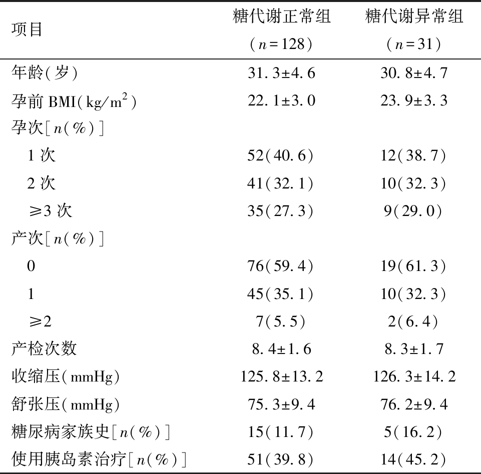 项目糖代谢正常组(n=128)糖代谢异常组(n=31)年龄(岁)31.3±4.630.8±4.7孕前BMI(kg/m2)22.1±3.023.9±3.3孕次[n(%)] 1次52(40.6)12(38.7) 2次41(32.1)10(32.3) ≥3次35(27.3)9(29.0)产次[n(%)] 076(59.4)19(61.3) 145(35.1)10(32.3) ≥27(5.5)2(6.4)产检次数8.4±1.68.3±1.7收缩压(mmHg)125.8±13.2126.3±14.2舒张压(mmHg)75.3±9.476.2±9.4糖尿病家族史[n(%)]15(11.7)5(16.2)使用胰岛素治疗[n(%)]51(39.8)14(45.2)