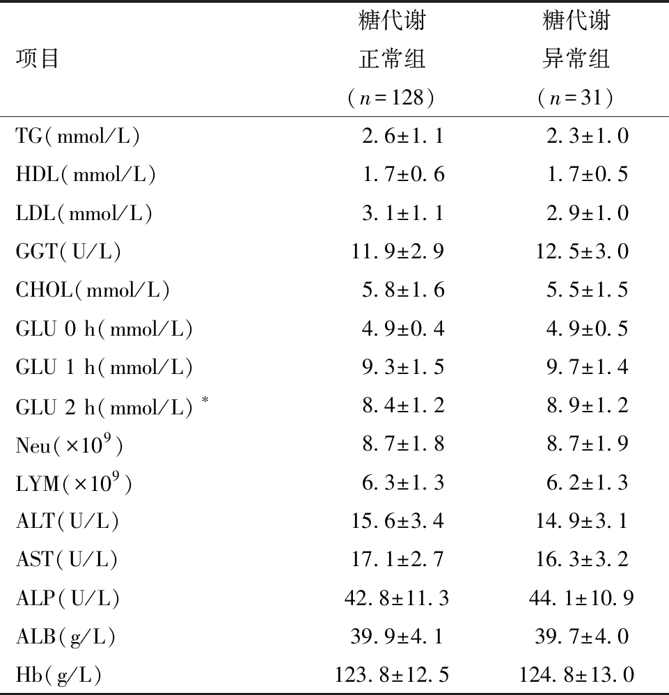 项目糖代谢正常组(n=128)糖代谢异常组(n=31)TG(mmol/L) 2.6±1.1 2.3±1.0HDL(mmol/L) 1.7±0.6 1.7±0.5LDL(mmol/L) 3.1±1.1 2.9±1.0GGT(U/L)11.9±2.912.5±3.0CHOL(mmol/L) 5.8±1.6 5.5±1.5GLU 0 h(mmol/L) 4.9±0.4 4.9±0.5GLU 1 h(mmol/L) 9.3±1.5 9.7±1.4GLU 2 h(mmol/L)∗ 8.4±1.2 8.9±1.2Neu(×109) 8.7±1.8 8.7±1.9LYM(×109) 6.3±1.3 6.2±1.3ALT(U/L)15.6±3.414.9±3.1AST(U/L)17.1±2.716.3±3.2ALP(U/L)42.8±11.344.1±10.9ALB(g/L)39.9±4.139.7±4.0Hb(g/L)123.8±12.5124.8±13.0