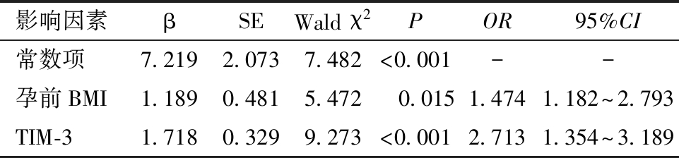 4.GDM孕妇产后糖代谢异常的危险因素:以GDM孕妇产后糖代谢异常为因变量(赋值:否=0,是=1),以孕前BMI(赋值:实际值输入)、GLU 2 h(赋值:实际值输入)和TIM-3(赋值:实际值输入)为自变量,多因素Logistics回归分析结果显示,孕前BMI和TIM-3均是GDM孕妇发生糖代谢异常的危险因素(P<0.001)。见表3。
