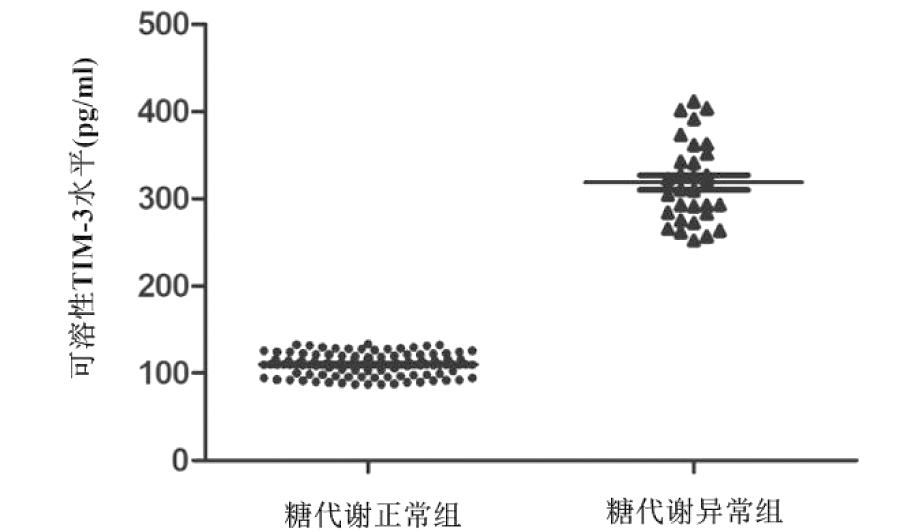 3.两组孕妇血清中可溶性TIM-3水平比较:糖代谢正常组患者血清中可溶性TIM-3水平为(110.7±21.7)pg/mL,糖代谢异常组患者血清中可溶性TIM-3水平为(326.8±84.8)pg/mL,糖代谢异常组患者血清中可溶性TIM-3水平明显高于糖代谢正常组,差异具有统计学意义(P<0.001)。见图1。