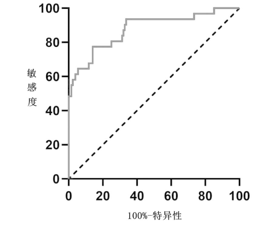 5.可溶性TIM-3预测妊娠期糖尿病患者产后糖代谢异常的价值:ROC曲线分析结果显示,可溶性TIM-3对产后糖代谢异常具有较高的预测价值,AUC值为0.877,当临界值为202.7 pg/mL时,其灵敏度为83.9% ,特异度为77.3% 。见图2。