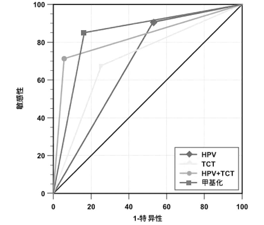 2.纳入标准:(1)均行高危HPV检测、TCT、Septin9甲基化检测与阴道镜活检组织病理学检测。(2)有过性生活的女性患者,没有宫颈治疗史,存在完整宫颈;(3)取样时未处于月经期及孕期,取样时机选择月经干净3~5 d内取样;(4)未合并其它妇科恶性肿瘤以及其他内外科疾病;(5)绝经期行宫颈癌筛查的女性。