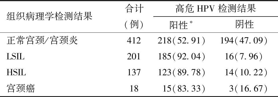 表2 高危HPV检测在各组织病理学检测结果中的检出率比较[例(%)]