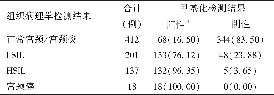 组织病理学检测结果合计(例)甲基化检测结果阳性∗阴性正常宫颈/宫颈炎41268(16.50)344(83.50)LSIL201153(76.12)48(23.88)HSIL137132(96.35)5(3.65)宫颈癌1818(100.00)0(0.00)