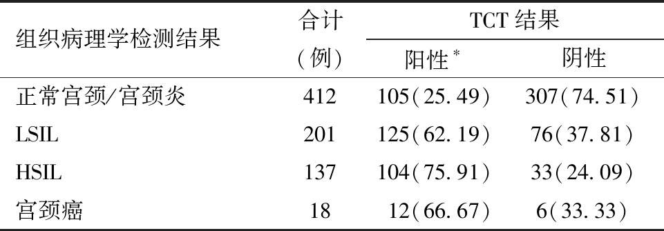 组织病理学检测结果合计(例)TCT结果阳性∗阴性正常宫颈/宫颈炎412105(25.49)307(74.51)LSIL201125(62.19)76(37.81)HSIL137104(75.91)33(24.09)宫颈癌1812(66.67)6(33.33)