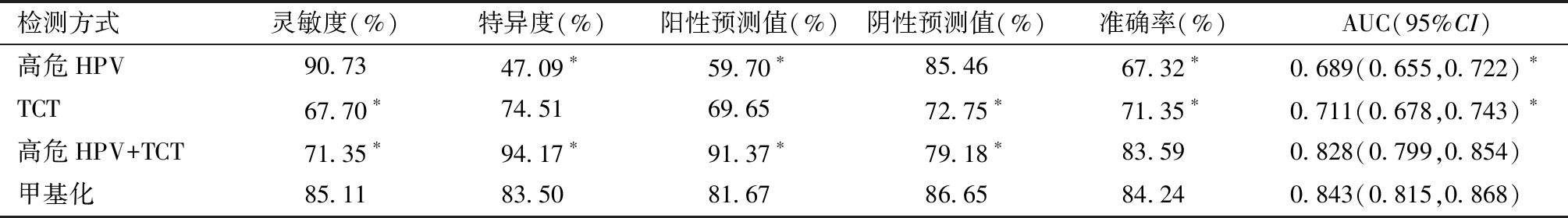 检测方式灵敏度(%)特异度(%)阳性预测值(%)阴性预测值(%)准确率(%)AUC(95%CI)高危HPV90.7347.09∗59.70∗85.4667.32∗0.689(0.655,0.722)∗TCT67.70∗74.5169.6572.75∗71.35∗0.711(0.678,0.743)∗高危HPV+TCT71.35∗94.17∗91.37∗79.18∗83.590.828(0.799,0.854)甲基化85.1183.5081.6786.6584.240.843(0.815,0.868)