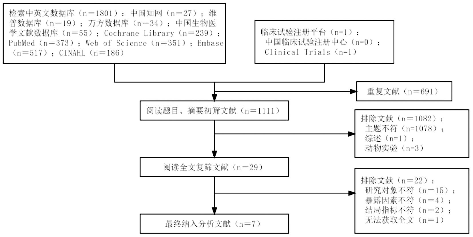 2.排除标准:(1)无法提取数据;(2)无法获取全文;(3)文献重复发表或使用资料相似的研究;(4)文献语言非中英文;(5)文献偏倚风险高,即文献质量评价为低质量。