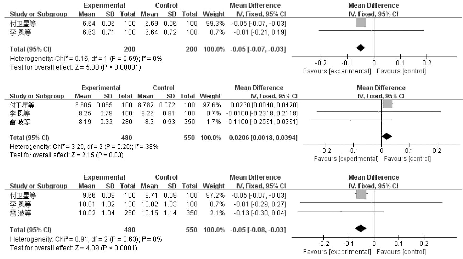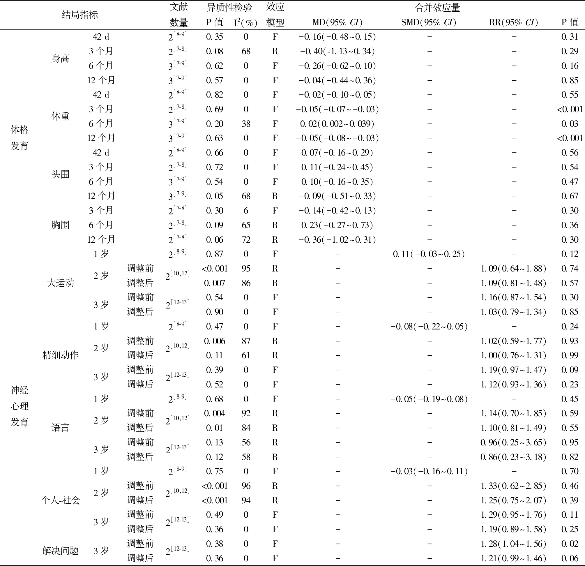 结局指标文献数量异质性检验P值I2(%)效应模型合并效应量MD(95% CI)SMD(95% CI)RR(95% CI)P值体格发育身高体重头围胸围42 d2[8-9]0.350F-0.16(-0.48~0.15)--0.313个月2[7-8]0.0868R-0.40(-1.13~0.34)--0.296个月3[7-9]0.620F-0.26(-0.62~0.10)--0.1612个月3[7-9]0.570F-0.04(-0.44~0.36)--0.8542 d2[8-9]0.820F-0.02(-0.10~0.05)--0.553个月2[7-8]0.690F-0.05(-0.07~-0.03)--<0.0016个月3[7-9]0.2038F0.02(0.002~0.039)--0.0312个月3[7-9]0.630F-0.05(-0.08~-0.03)--<0.00142 d2[8-9]0.660F0.07(-0.16~0.29)--0.563个月2[7-8]0.720F0.11(-0.24~0.45)--0.546个月3[7-9]0.540F0.10(-0.16~0.35)--0.4712个月3[7-9]0.0568R-0.09(-0.51~0.33)--0.673个月2[7-8]0.306F-0.14(-0.42~0.13)--0.306个月2[7-8]0.0965R0.23(-0.27~0.73)--0.3612个月2[7-8]0.0672R-0.36(-1.02~0.31)--0.30神经心理发育大运动精细动作语言个人-社会解决问题1岁2岁3岁1岁2岁3岁1岁2岁3岁1岁2岁3岁3岁调整前调整后调整前调整后调整前调整后调整前调整后调整前调整后调整前调整后调整前调整后调整前调整后调整前调整后2[8-9]2[10,12]2[12-13]2[8-9]2[10,12]2[12-13]2[8-9]2[10,12]2[12-13]2[8-9]2[10,12]2[12-13]2[12-13]0.870F-0.11(-0.03~0.25)-0.12<0.00195R--1.09(0.64~1.88)0.740.00786R--1.09(0.81~1.48)0.570.540F--1.16(0.87~1.54)0.300.900F--1.03(0.79~1.34)0.850.470F--0.08(-0.22~0.05)-0.240.00687R--1.02(0.59~1.77)0.930.1161R--1.00(0.76~1.31)0.990.390F--1.19(0.97~1.47)0.090.520F--1.12(0.93~1.36)0.230.680F--0.05(-0.19~0.08)-0.450.00492R--1.14(0.70~1.85)0.590.0184R--1.10(0.81~1.49)0.550.1356R--0.96(0.25~3.65)0.950.1258R--0.86(0.23~3.18)0.820.750F--0.03(-0.16~0.11)-0.70<0.00196R--1.33(0.62~2.85)0.46<0.00194R--1.25(0.75~2.07)0.390.490F--1.29(0.95~1.76)0.110.360F--1.19(0.89~1.58)0.250.380F--1.28(1.04~1.56)0.020.360F--1.21(0.99~1.46)0.06