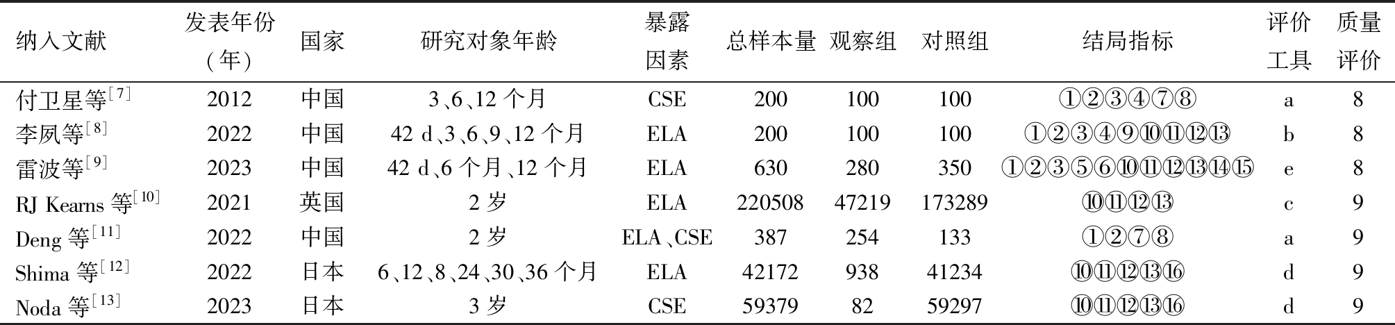 纳入文献发表年份(年)国家研究对象年龄暴露因素总样本量观察组对照组结局指标评价工具质量评价付卫星等[7]2012中国3、6、12个月CSE200100100①②③④⑦⑧a8李夙等[8]2022中国42 d、3、6、9、12个月ELA200100100①②③④⑨⑩ b8雷波等[9]2023中国42 d、6个月、12个月ELA630280350①②③⑤⑥⑩ e8RJ Kearns等[10]2021英国2岁ELA22050847219173289⑩ c9Deng等[11]2022中国2岁ELA、CSE387254133①②⑦⑧a9Shima等[12]2022日本6、12、8、24、30、36个月ELA4217293841234⑩ d9Noda等[13]2023日本3岁CSE593798259297⑩ d9