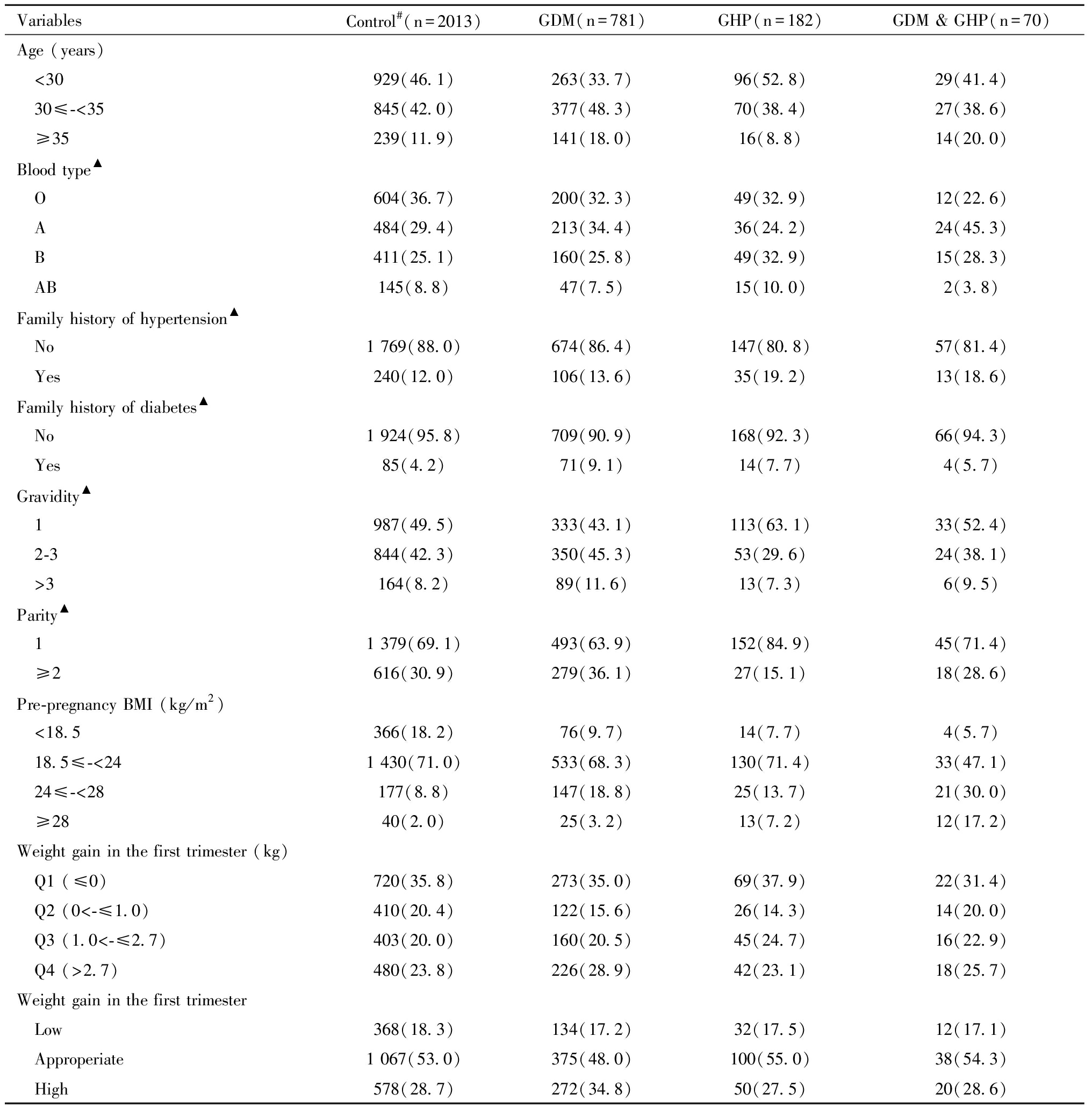 VariablesControl# (n=2013)GDM(n=781)GHP(n=182)GDM & GHP(n=70)Age (years) <30929(46.1)263(33.7)96(52.8)29(41.4) 30≤-<35845(42.0)377(48.3)70(38.4)27(38.6) ≥35239(11.9)141(18.0)16(8.8)14(20.0)Blood type▲ O604(36.7)200(32.3)49(32.9)12(22.6) A484(29.4)213(34.4)36(24.2)24(45.3) B411(25.1)160(25.8)49(32.9)15(28.3) AB145(8.8)47(7.5)15(10.0)2(3.8)Family history of hypertension▲ No1 769(88.0)674(86.4)147(80.8)57(81.4) Yes240(12.0)106(13.6)35(19.2)13(18.6)Family history of diabetes▲ No1 924(95.8)709(90.9)168(92.3)66(94.3) Yes85(4.2)71(9.1)14(7.7)4(5.7)Gravidity▲ 1987(49.5)333(43.1)113(63.1)33(52.4) 2-3844(42.3)350(45.3)53(29.6)24(38.1) >3164(8.2)89(11.6)13(7.3)6(9.5)Parity▲ 11 379(69.1)493(63.9)152(84.9)45(71.4) ≥2616(30.9)279(36.1)27(15.1)18(28.6)Pre-pregnancy BMI (kg/m2) <18.5366(18.2)76(9.7)14(7.7)4(5.7) 18.5≤-<241 430(71.0)533(68.3)130(71.4)33(47.1) 24≤-<28177(8.8)147(18.8)25(13.7)21(30.0) ≥2840(2.0)25(3.2)13(7.2)12(17.2)Weight gain in the first trimester (kg) Q1 (≤0)720(35.8)273(35.0)69(37.9)22(31.4) Q2 (0<-≤1.0)410(20.4)122(15.6)26(14.3)14(20.0) Q3 (1.0<-≤2.7)403(20.0)160(20.5)45(24.7)16(22.9) Q4 (>2.7)480(23.8)226(28.9)42(23.1)18(25.7)Weight gain in the first trimester Low368(18.3)134(17.2)32(17.5)12(17.1) Approperiate1 067(53.0)375(48.0)100(55.0)38(54.3) High578(28.7)272(34.8)50(27.5)20(28.6)