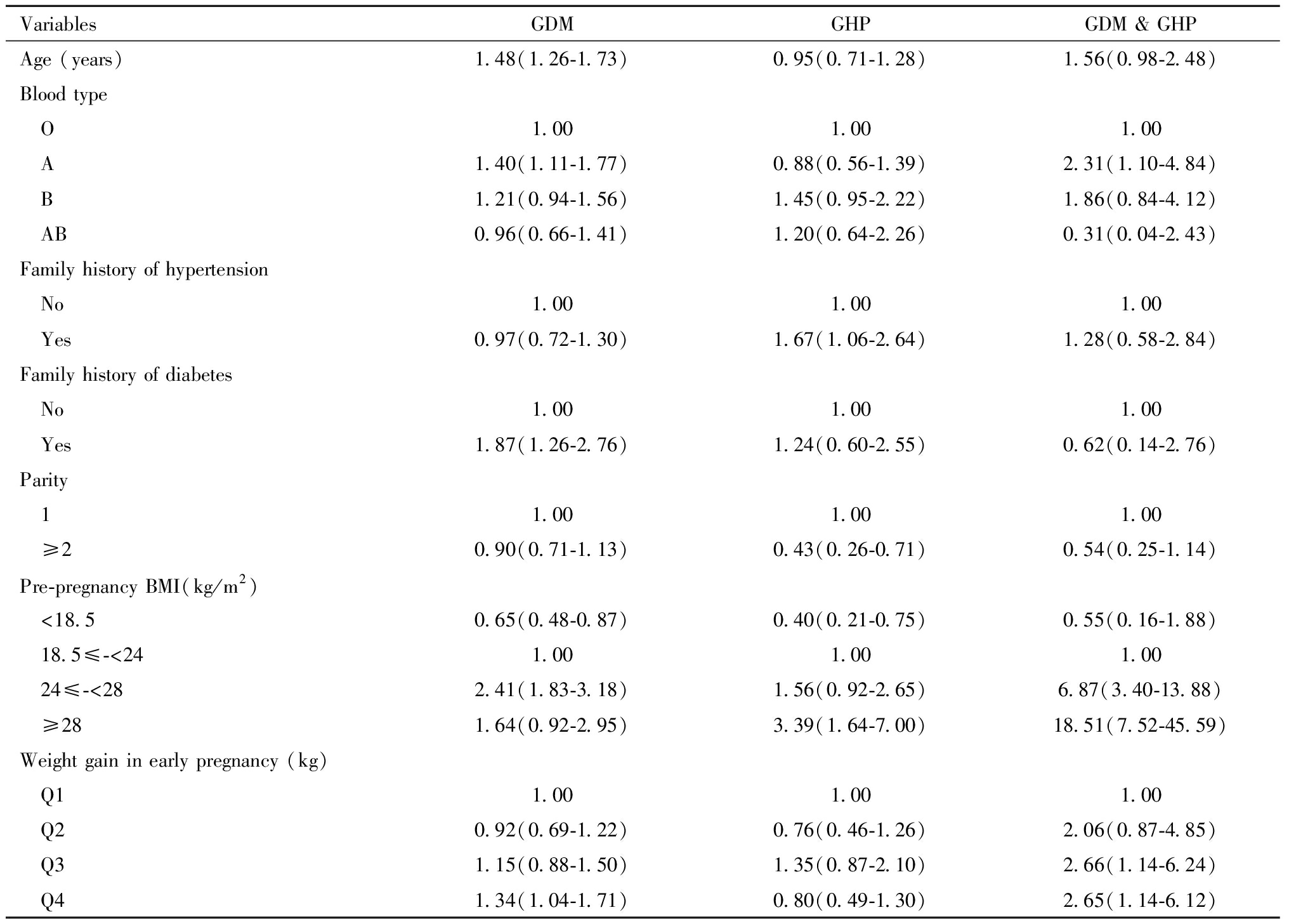 VariablesGDMGHPGDM & GHPAge (years)1.48(1.26-1.73)0.95(0.71-1.28)1.56(0.98-2.48)Blood type O1.001.001.00 A1.40(1.11-1.77)0.88(0.56-1.39)2.31(1.10-4.84) B1.21(0.94-1.56)1.45(0.95-2.22)1.86(0.84-4.12) AB0.96(0.66-1.41)1.20(0.64-2.26)0.31(0.04-2.43)Family history of hypertension No1.001.001.00 Yes0.97(0.72-1.30)1.67(1.06-2.64)1.28(0.58-2.84)Family history of diabetes No1.001.001.00 Yes1.87(1.26-2.76)1.24(0.60-2.55)0.62(0.14-2.76)Parity 11.001.001.00 ≥20.90(0.71-1.13)0.43(0.26-0.71)0.54(0.25-1.14)Pre-pregnancy BMI(kg/m2) <18.50.65(0.48-0.87)0.40(0.21-0.75)0.55(0.16-1.88) 18.5≤-<241.001.001.00 24≤-<282.41(1.83-3.18)1.56(0.92-2.65)6.87(3.40-13.88) ≥281.64(0.92-2.95)3.39(1.64-7.00)18.51(7.52-45.59)Weight gain in early pregnancy (kg) Q11.001.001.00 Q2 0.92(0.69-1.22)0.76(0.46-1.26)2.06(0.87-4.85) Q31.15(0.88-1.50)1.35(0.87-2.10)2.66(1.14-6.24) Q41.34(1.04-1.71)0.80(0.49-1.30)2.65(1.14-6.12)