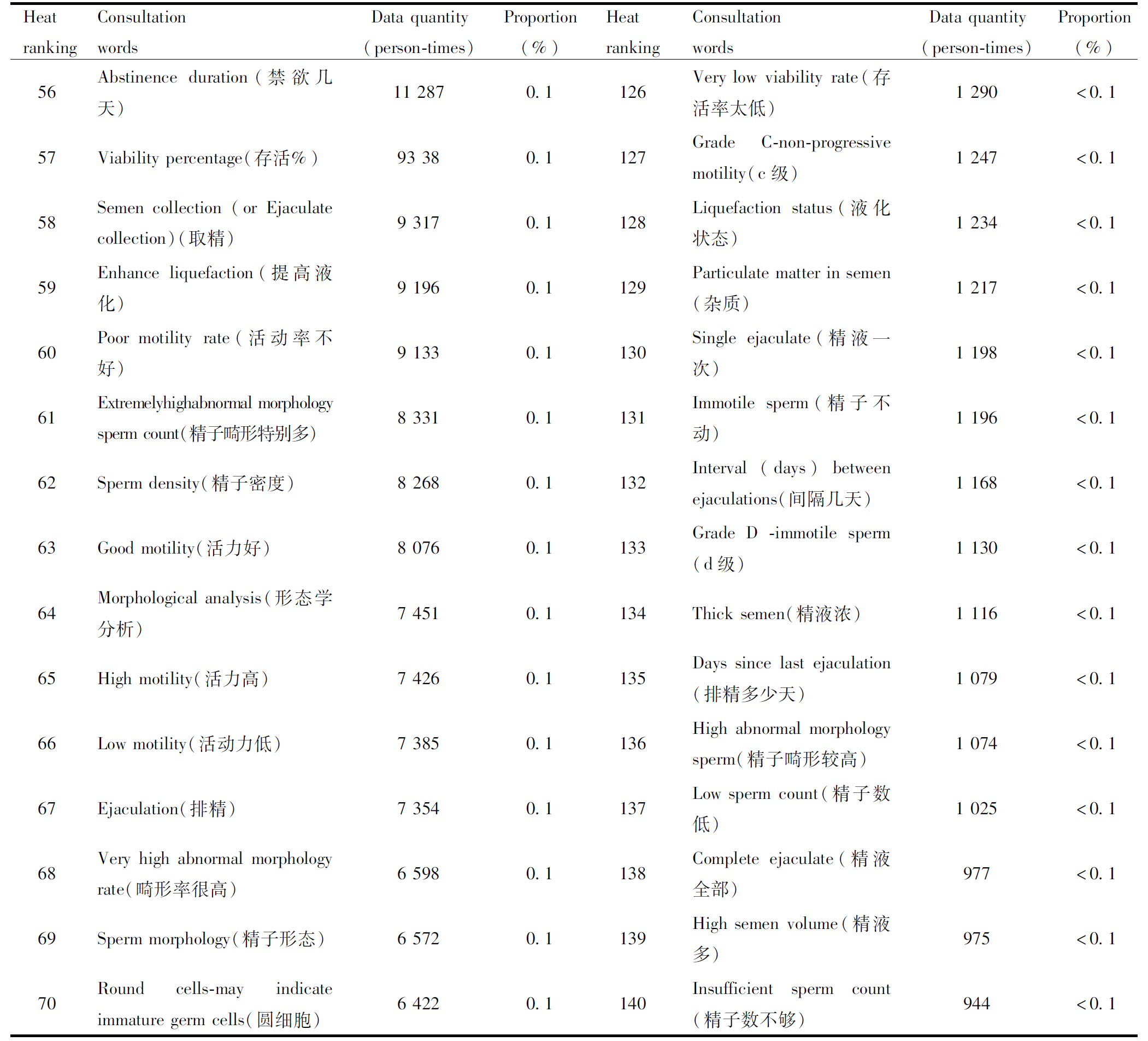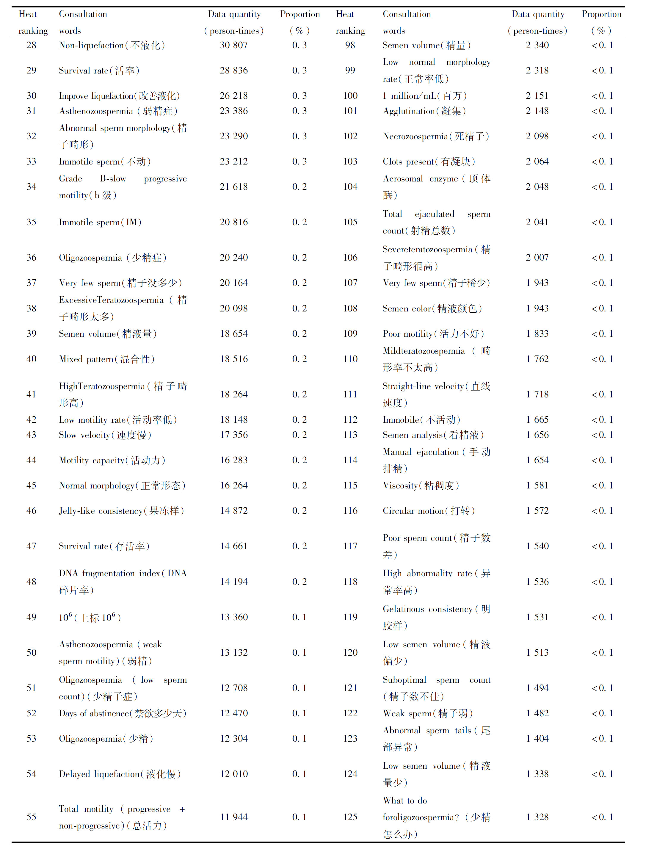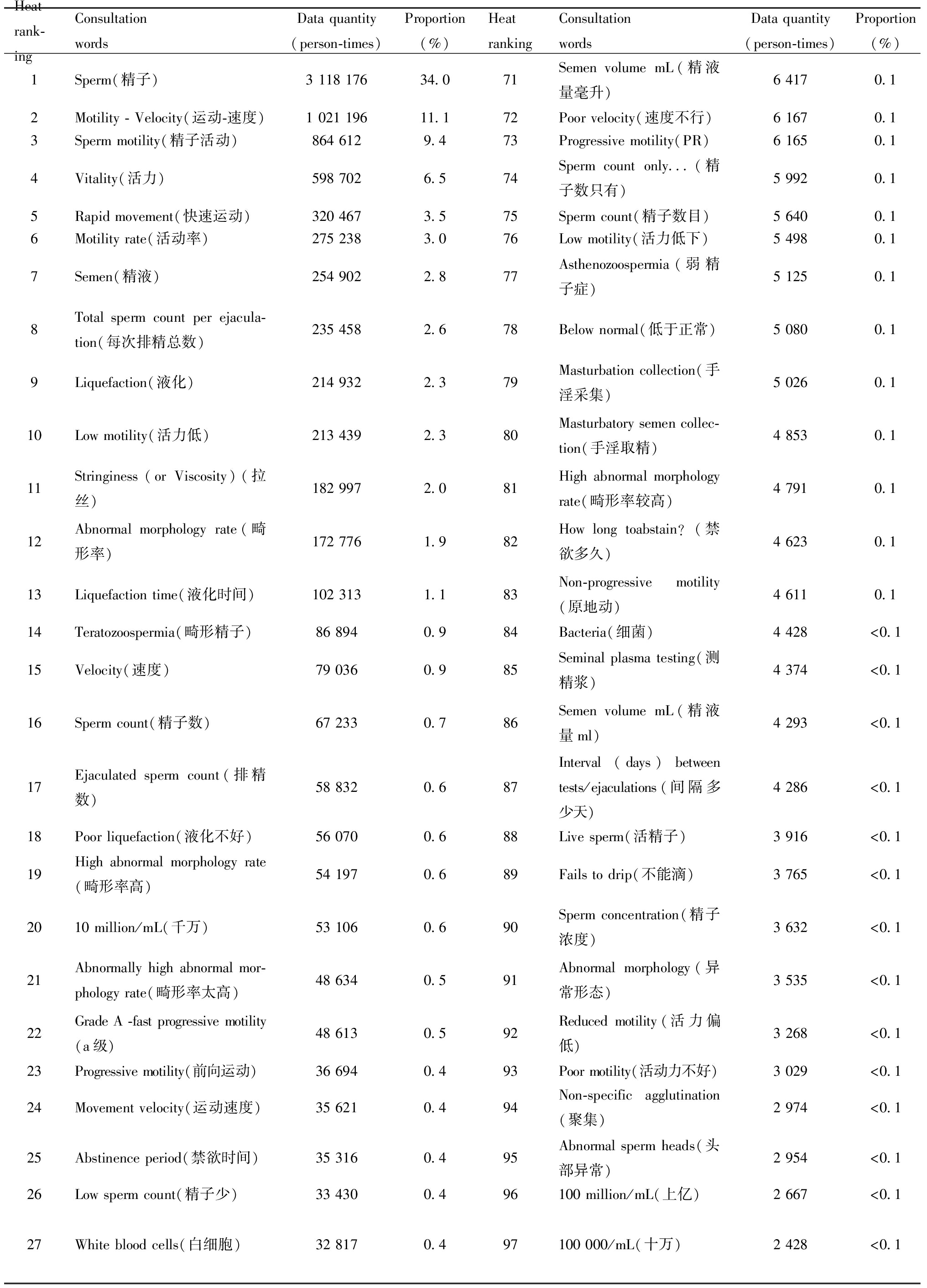 Heat rank-ingConsultation wordsData quantity(person-times)Proportion(%)Heat rankingConsultation wordsData quantity(person-times)Proportion(%)1Sperm(精子)3 118 17634.071Semen volume mL(精液量毫升)6 4170.12Motility - Velocity(运动-速度)1 021 19611.172Poor velocity(速度不行)6 1670.13Sperm motility(精子活动)864 6129.473Progressive motility(PR)6 1650.14Vitality(活力)598 7026.574Sperm count only...(精子数只有)5 9920.15Rapid movement(快速运动)320 4673.575Sperm count(精子数目)5 6400.16Motility rate(活动率)275 2383.076Low motility(活力低下)5 4980.17Semen(精液)254 9022.877Asthenozoospermia(弱精子症)5 1250.18Total sperm count per ejacula-tion(每次排精总数)235 4582.678Below normal(低于正常)5 0800.19Liquefaction(液化)214 9322.379Masturbation collection(手淫采集)5 0260.110Low motility(活力低)213 4392.380Masturbatory semen collec-tion(手淫取精)4 8530.111Stringiness (or Viscosity)(拉丝)182 9972.081High abnormal morphology rate(畸形率较高)4 7910.112Abnormal morphology rate(畸形率)172 7761.982How long toabstain?(禁欲多久)4 6230.113Liquefaction time(液化时间)102 3131.183Non-progressive motility(原地动)4 6110.114Teratozoospermia(畸形精子)86 8940.984Bacteria(细菌)4 428<0.115Velocity(速度)79 0360.985Seminal plasma testing(测精浆)4 374<0.116Sperm count(精子数)67 2330.786Semen volume mL(精液量ml)4 293<0.117Ejaculated sperm count(排精数)58 8320.687Interval (days) between tests/ejaculations(间隔多少天)4 286<0.118Poor liquefaction(液化不好)56 0700.688Live sperm(活精子)3 916<0.119High abnormal morphology rate(畸形率高)54 1970.689Fails to drip(不能滴)3 765<0.12010 million/mL(千万)53 1060.690Sperm concentration(精子浓度)3 632<0.121Abnormally high abnormal mor-phology rate(畸形率太高)48 6340.591Abnormal morphology(异常形态)3 535<0.122Grade A -fast progressive motility(a级)48 6130.592Reduced motility(活力偏低)3 268<0.123Progressive motility(前向运动)36 6940.493Poor motility(活动力不好)3 029<0.124Movement velocity(运动速度)35 6210.494Non-specific agglutination(聚集)2 974<0.125Abstinence period(禁欲时间)35 3160.495Abnormal sperm heads(头部异常)2 954<0.126Low sperm count(精子少)33 4300.496100 million/mL(上亿)2 667<0.127White blood cells(白细胞)32 8170.497100 000/mL(十万)2 428<0.1