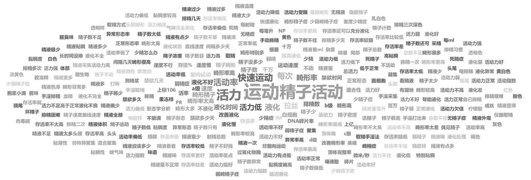 黏稠度的咨询词包括拉丝(占96.5%)、不能滴(占2.0%)及黏稠度、高黏稠、黏稠度偏高、精液黏稠、成丝、黏稠度、黏稠度较高、黏稠性、特别黏稠、黏滞性[占(<0.1%)~0.8%]共12个。