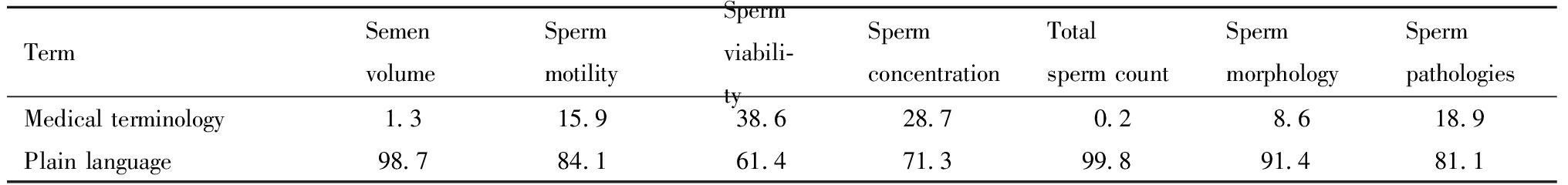 TermSemenvolumeSpermmotilitySperm viabili-ty Sperm concentrationTotal sperm countSperm morphologySperm pathologiesMedical terminology1.315.938.628.7 0.2 8.6 18.9 Plain language98.784.161.471.3 99.8 91.4 81.1