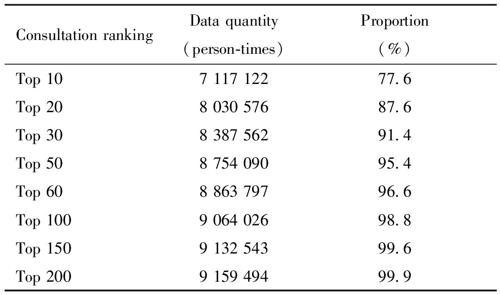 Consultation rankingData quantity(person-times)Proportion(%)Top 107 117 12277.6Top 208 030 57687.6Top 308 387 56291.4Top 508 754 09095.4Top 608 863 79796.6Top 1009 064 02698.8Top 1509 132 54399.6Top 2009 159 49499.9