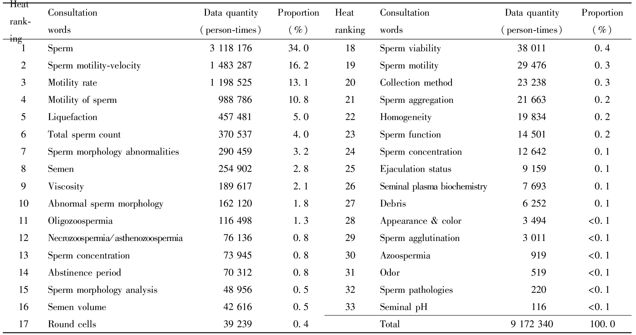 Heat rank-ingConsultation wordsData quantity(person-times)Proportion(%)Heat rankingConsultation wordsData quantity(person-times)Proportion(%)1Sperm3 118 17634.018Sperm viability38 0110.42Sperm motility-velocity1 483 28716.219Sperm motility29 4760.33 Motility rate1 198 52513.120Collection method23 2380.34Motility of sperm988 78610.821Sperm aggregation21 6630.25Liquefaction457 4815.022Homogeneity19 8340.26 Total sperm count370 5374.023Sperm function14 5010.27Sperm morphology abnormalities290 4593.224Sperm concentration12 6420.18Semen254 9022.825Ejaculation status9 1590.19Viscosity189 6172.126Seminal plasma biochemistry7 6930.110Abnormal sperm morphology162 1201.827Debris6 2520.111Oligozoospermia116 4981.328Appearance & color3 494<0.112Necrozoospermia/asthenozoospermia76 1360.829Sperm agglutination3 011<0.113Sperm concentration73 9450.830Azoospermia919<0.114Abstinence period70 3120.831Odor519<0.115 Sperm morphology analysis48 9560.532 Sperm pathologies220<0.116Semen volume42 6160.533Seminal pH116<0.117Round cells39 2390.4Total9 172 340100.0