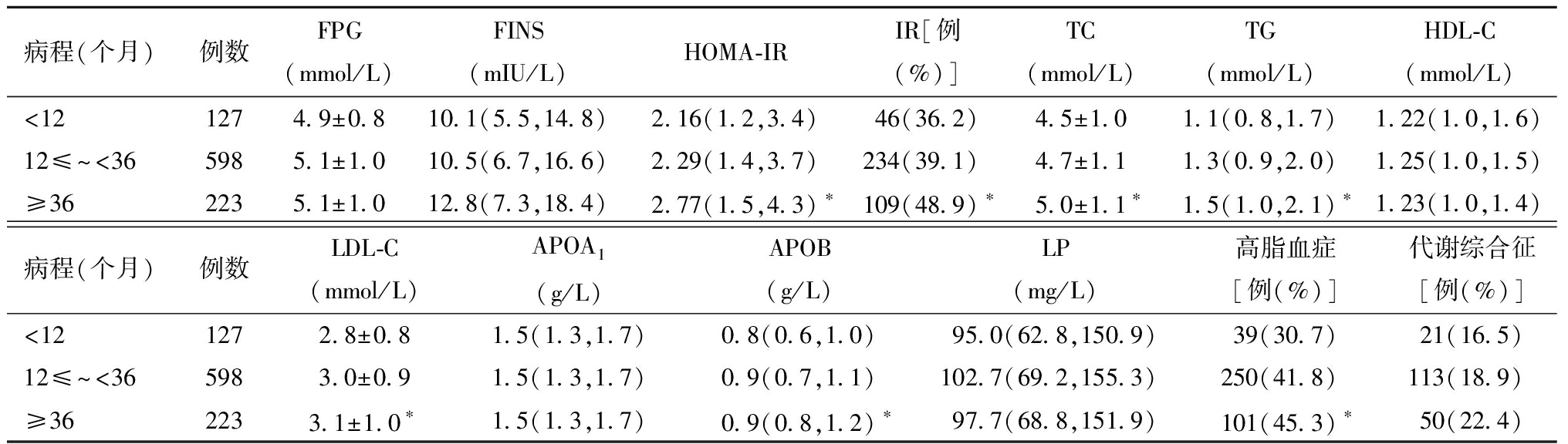 病程(个月)例数FPG(mmol/L)FINS(mIU/L)HOMA-IRIR[例(%)]TC(mmol/L)TG(mmol/L)HDL-C(mmol/L)<121274.9±0.810.1(5.5,14.8)2.16(1.2,3.4)46(36.2)4.5±1.01.1(0.8,1.7)1.22(1.0,1.6)12≤~<365985.1±1.010.5(6.7,16.6)2.29(1.4,3.7)234(39.1)4.7±1.11.3(0.9,2.0)1.25(1.0,1.5)≥362235.1±1.012.8(7.3,18.4)2.77(1.5,4.3)∗109(48.9)∗5.0±1.1∗1.5(1.0,2.1) ∗1.23(1.0,1.4)病程(个月)例数LDL-C(mmol/L)APOA1(g/L)APOB(g/L)LP(mg/L)高脂血症[例(%)]代谢综合征[例(%)]<121272.8±0.81.5(1.3,1.7)0.8(0.6,1.0)95.0(62.8,150.9)39(30.7)21(16.5)12≤~<365983.0±0.91.5(1.3,1.7)0.9(0.7,1.1)102.7(69.2,155.3)250(41.8)113(18.9)≥362233.1±1.0∗1.5(1.3,1.7)0.9(0.8,1.2)∗97.7(68.8,151.9)101(45.3)∗50(22.4)