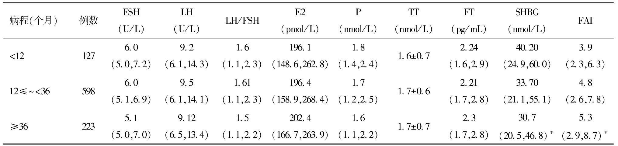 病程(个月)例数FSH(U/L)LH(U/L)LH/FSHE2 (pmol/L)P (nmol/L)TT (nmol/L)FT (pg/mL)SHBG(nmol/L)FAI<121276.0 (5.0,7.2)9.2(6.1,14.3)1.6(1.1,2.3)196.1(148.6,262.8)1.8(1.4,2.4)1.6±0.72.24 (1.6,2.9)40.20(24.9,60.0)3.9(2.3,6.3)12≤~<365986.0 (5.1,6.9)9.5 (6.1,14.1)1.61(1.1,2.3)196.4(158.9,268.4)1.7(1.2,2.5)1.7±0.62.21(1.7,2.8)33.70(21.1,55.1)4.8(2.6,7.8)≥362235.1 (5.0,7.0)9.12 (6.5,13.4)1.5 (1.1,2.2)202.4(166.7,263.9)1.6(1.1,2.2)1.7±0.72.3 (1.7,2.8)30.7(20.5,46.8)∗5.3(2.9,8.7)∗