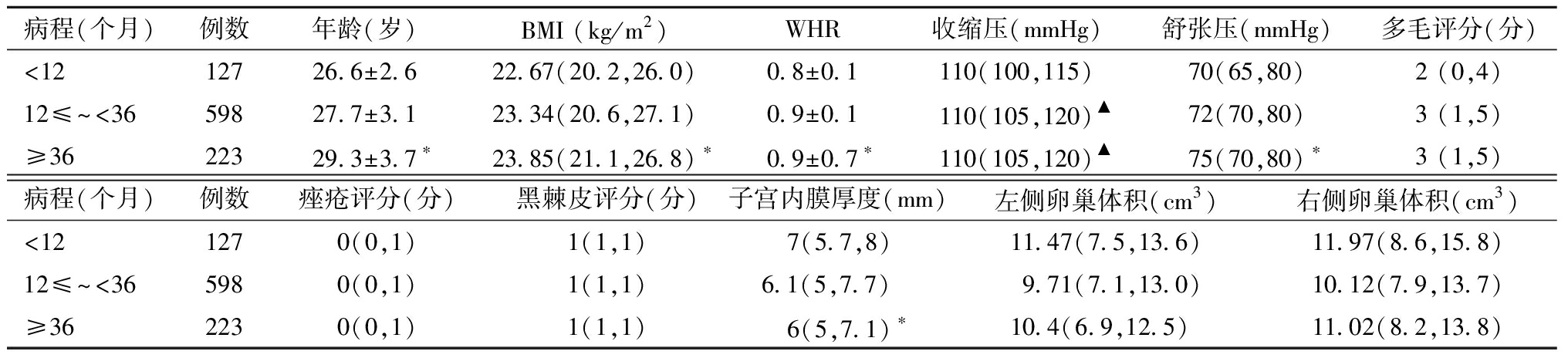病程(个月)例数年龄(岁)BMI (kg/m2)WHR收缩压(mmHg)舒张压(mmHg)多毛评分(分)<1212726.6±2.622.67(20.2,26.0)0.8±0.1110(100,115)70(65,80)2 (0,4)12≤~<3659827.7±3.123.34(20.6,27.1)0.9±0.1110(105,120)▲72(70,80)3 (1,5)≥3622329.3±3.7∗23.85(21.1,26.8) ∗0.9±0.7∗110(105,120)▲75(70,80) ∗3 (1,5)病程(个月)例数痤疮评分(分)黑棘皮评分(分)子宫内膜厚度(mm)左侧卵巢体积(cm3)右侧卵巢体积(cm3)<121270(0,1)1(1,1) 7(5.7,8)11.47(7.5,13.6)11.97(8.6,15.8)12≤~<365980(0,1)1(1,1)6.1(5,7.7)9.71(7.1,13.0)10.12(7.9,13.7)≥362230(0,1)1(1,1) 6(5,7.1) ∗10.4(6.9,12.5)11.02(8.2,13.8)
