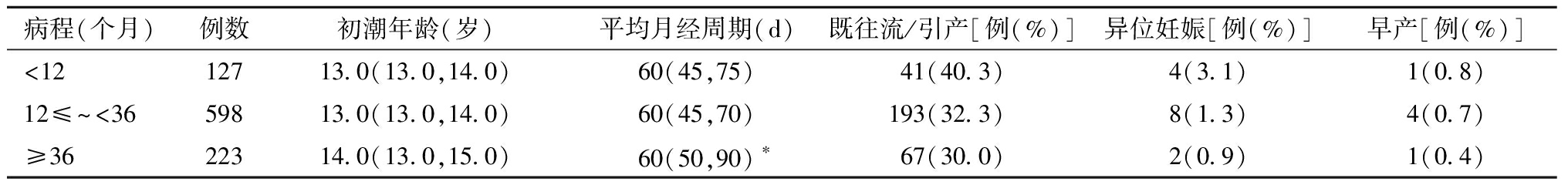 病程(个月)例数初潮年龄(岁)平均月经周期(d)既往流/引产[例(%)]异位妊娠[例(%)]早产[例(%)]<1212713.0(13.0,14.0)60(45,75)41(40.3)4(3.1)1(0.8)12≤~<3659813.0(13.0,14.0)60(45,70)193(32.3)8(1.3)4(0.7)≥3622314.0(13.0,15.0)60(50,90) ∗67(30.0)2(0.9)1(0.4)