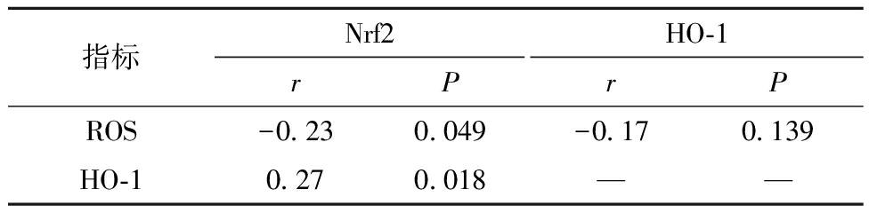 表7 冷冻复苏后精子ROS与Nrf2、HO-1水平间的相关性分析