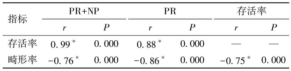 指标 PR+NPrPPRrP存活率rP存活率0.99∗ 0.000 0.88∗0.000——畸形率-0.76∗ 0.000-0.86∗0.000 -0.75∗ 0.000