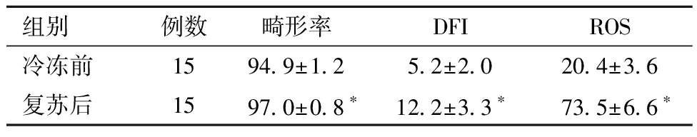 组别例数畸形率DFIROS冷冻前1594.9±1.2 5.2±2.020.4±3.6 复苏后1597.0±0.8∗12.2±3.3∗73.5±6.6∗