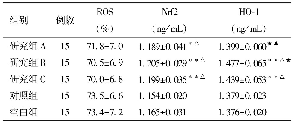 组别例数ROS(%)Nrf2(ng/mL)HO-1(ng/mL)研究组A1571.8±7.01.189±0.041∗△1.399±0.060★▲研究组B1570.5±6.91.205±0.029∗∗△1.477±0.065∗∗△★研究组C1570.0±6.81.199±0.035∗∗△1.439±0.053∗∗△对照组1573.5±6.61.154±0.0201.379±0.023空白组1573.4±7.21.165±0.0311.376±0.020