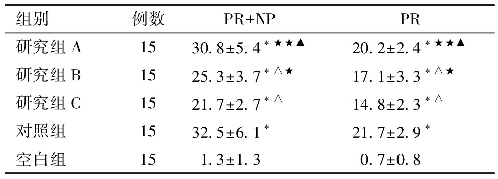 组别例数PR+NPPR研究组A1530.8±5.4∗★★▲20.2±2.4∗★★▲研究组B1525.3±3.7∗△★17.1±3.3∗△★研究组C1521.7±2.7∗△14.8±2.3∗△对照组1532.5±6.1∗21.7±2.9∗空白组151.3±1.3 0.7±0.8