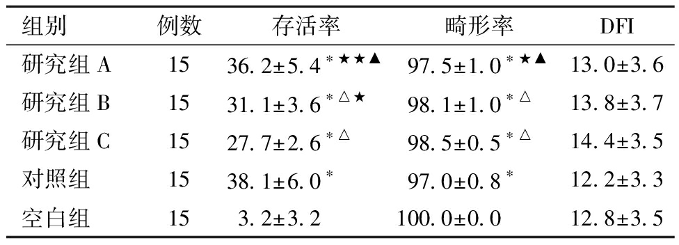 组别例数存活率畸形率DFI研究组A1536.2±5.4∗★★▲97.5±1.0∗★▲13.0±3.6研究组B1531.1±3.6∗△★98.1±1.0∗△13.8±3.7研究组C1527.7±2.6∗△98.5±0.5∗△14.4±3.5对照组1538.1±6.0∗97.0±0.8∗12.2±3.3空白组153.2±3.2100.0±0.012.8±3.5