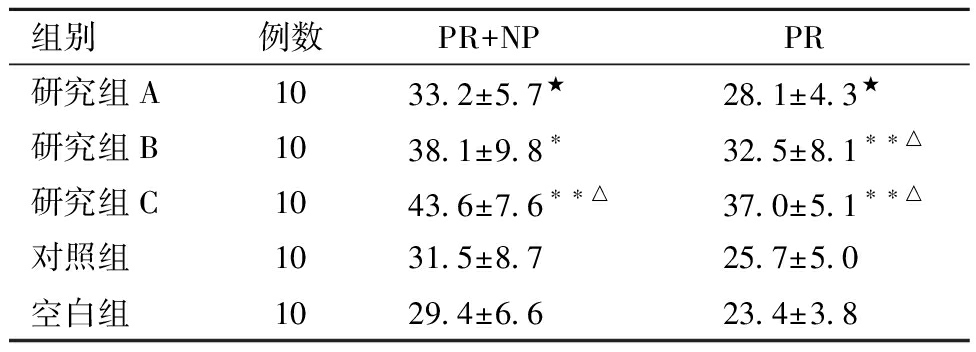 组别例数PR+NPPR研究组A1033.2±5.7★28.1±4.3★研究组B1038.1±9.8∗32.5±8.1∗∗△研究组C1043.6±7.6∗∗△37.0±5.1∗∗△对照组1031.5±8.725.7±5.0空白组1029.4±6.623.4±3.8