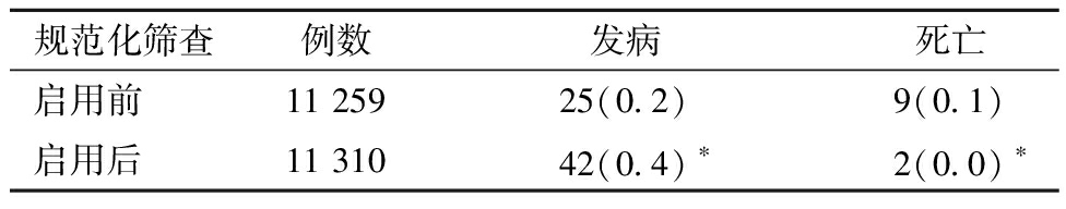 规范化筛查例数发病死亡启用前11 25925(0.2)9(0.1)启用后11 31042(0.4)∗2(0.0)∗