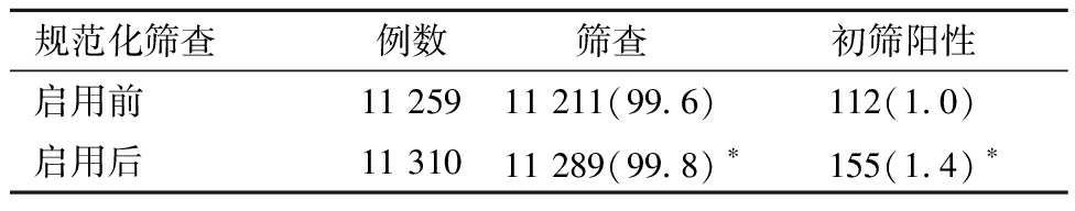 规范化筛查例数筛查初筛阳性启用前11 25911 211(99.6)112(1.0)启用后11 31011 289(99.8)∗155(1.4)∗