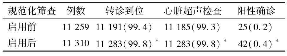 规范化筛查例数转诊到位心脏超声检查阳性确诊启用前 11 25911 191(99.4)11 185(99.3)25(0.2)启用后 11 31011 283(99.8)∗11 283(99.8)∗42(0.4)∗