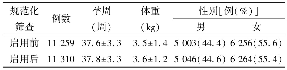 规范化筛查例数孕周(周)体重(kg)性别[例(%)]男女启用前11 25937.6±3.33.5±1.45 003(44.4)6 256(55.6)启用后11 31037.8±3.33.6±1.25 046(44.6)6 264(55.4)
