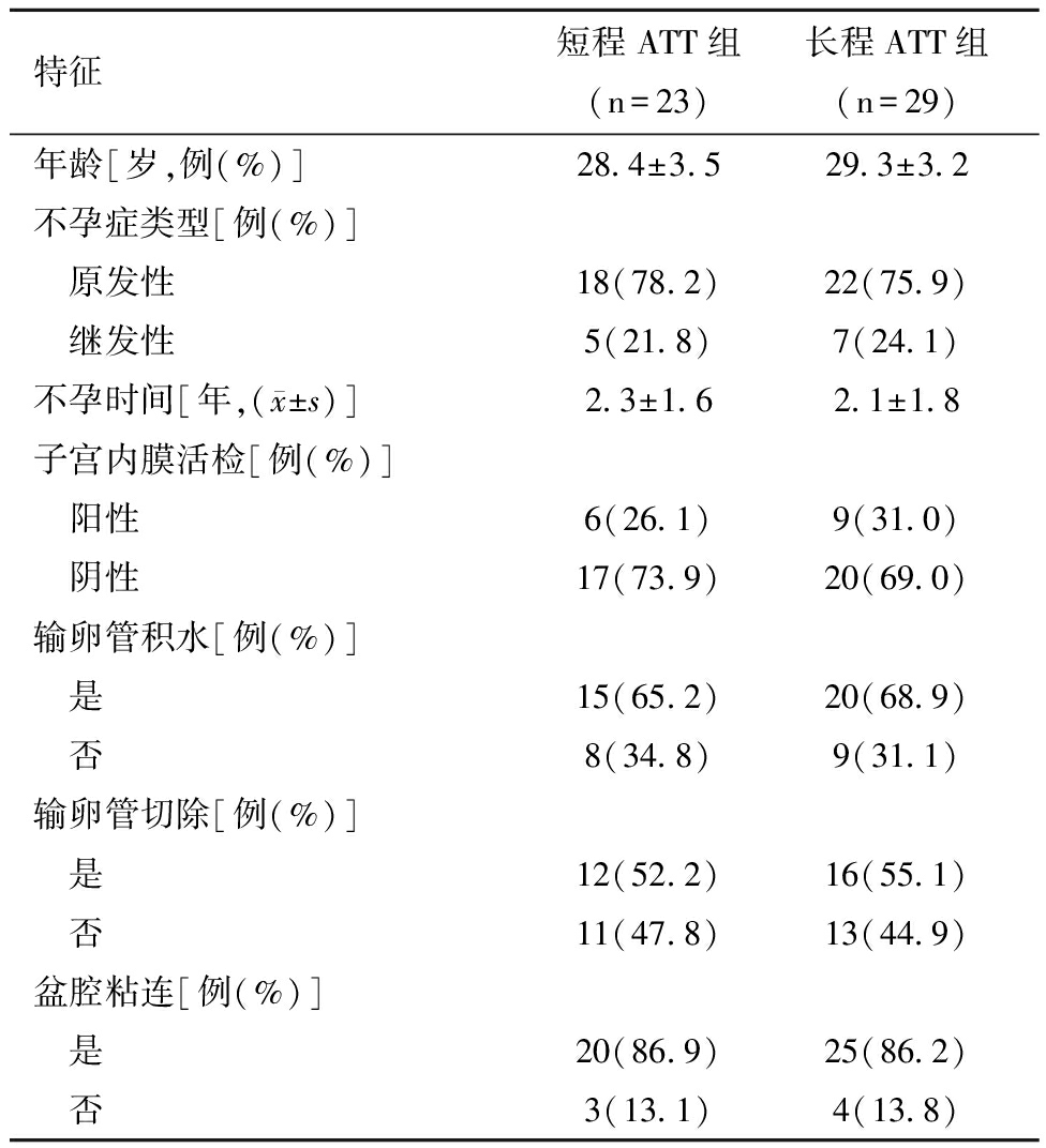 特征短程ATT组(n=23)长程ATT组(n=29)年龄[岁,例(%)]28.4±3.529.3±3.2不孕症类型[例(%)] 原发性18(78.2)22(75.9) 继发性5(21.8)7(24.1)不孕时间[年,(x±s)]2.3±1.62.1±1.8子宫内膜活检[例(%)] 阳性6(26.1)9(31.0) 阴性17(73.9)20(69.0)输卵管积水[例(%)] 是15(65.2)20(68.9) 否8(34.8)9(31.1)输卵管切除[例(%)] 是12(52.2)16(55.1) 否11(47.8)13(44.9)盆腔粘连[例(%)] 是20(86.9)25(86.2) 否3(13.1)4(13.8)