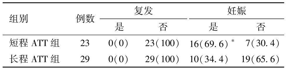 组别例数复发是否妊娠是否短程ATT组230(0)23(100)16(69.6)∗7(30.4)长程ATT组290(0)29(100)10(34.4)19(65.6)