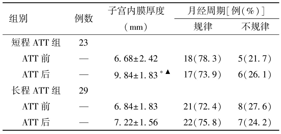 组别例数子宫内膜厚度(mm)月经周期[例(%)]规律不规律短程ATT组23ATT前—6.68±2.4218(78.3)5(21.7)ATT后—9.84±1.83∗▲17(73.9)6(26.1)长程ATT组29ATT前—6.84±1.8321(72.4)8(27.6)ATT后—7.22±1.5622(75.8)7(24.2)