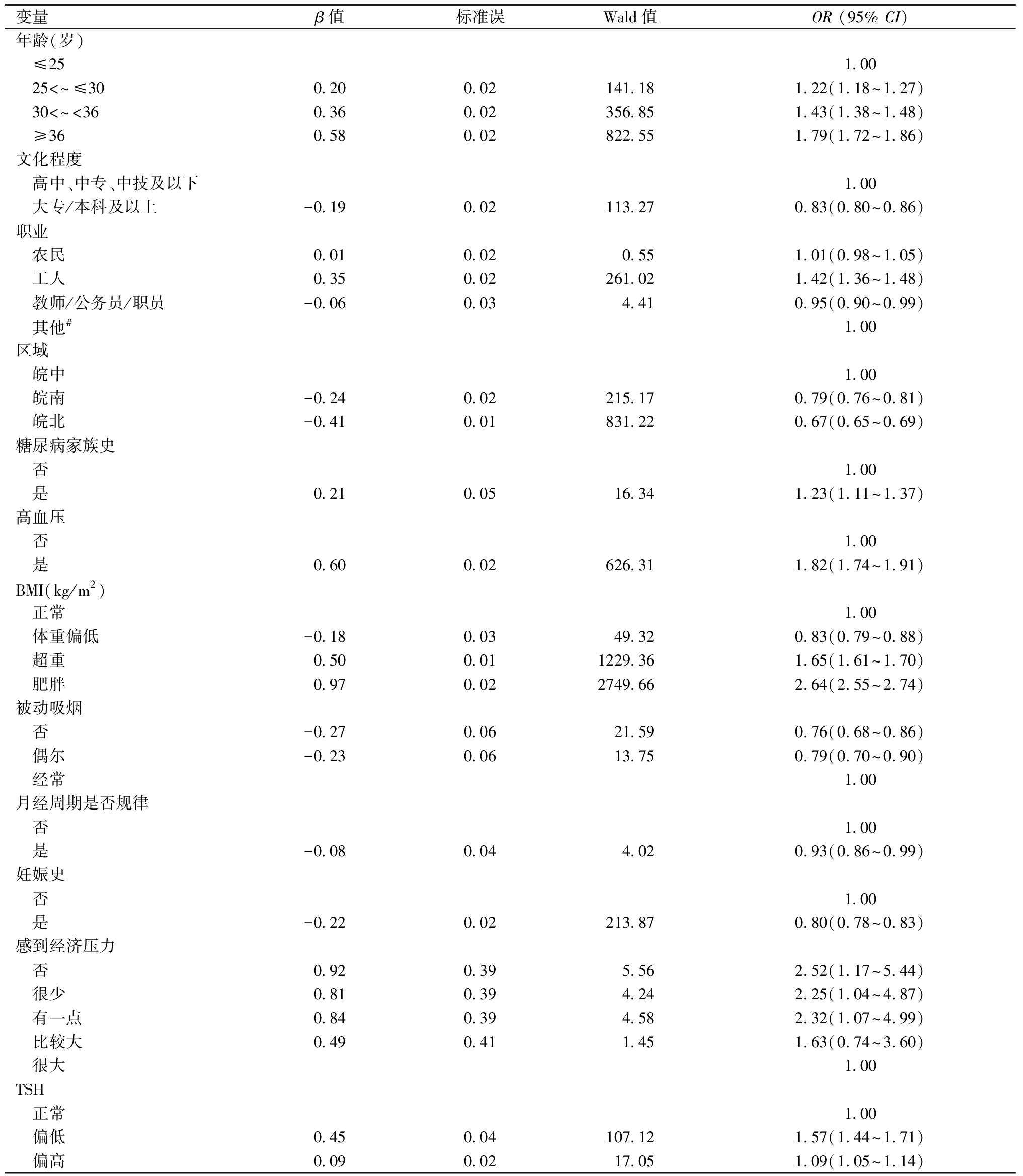 变量β值标准误Wald值OR (95% CI)年龄(岁) ≤251.00 25<~≤300.200.02141.181.22(1.18~1.27) 30<~<360.360.02356.851.43(1.38~1.48) ≥360.580.02822.551.79(1.72~1.86)文化程度 高中、中专、中技及以下1.00 大专/本科及以上-0.190.02113.270.83(0.80~0.86)职业 农民0.010.020.551.01(0.98~1.05) 工人0.350.02261.021.42(1.36~1.48) 教师/公务员/职员-0.060.034.410.95(0.90~0.99) 其他#1.00区域 皖中1.00 皖南-0.240.02215.170.79(0.76~0.81) 皖北-0.410.01831.220.67(0.65~0.69)糖尿病家族史 否1.00 是0.210.0516.341.23(1.11~1.37)高血压 否1.00 是0.600.02626.311.82(1.74~1.91)BMI(kg/m2) 正常1.00 体重偏低-0.180.0349.320.83(0.79~0.88) 超重0.500.011229.361.65(1.61~1.70) 肥胖0.970.022749.662.64(2.55~2.74)被动吸烟 否-0.270.0621.590.76(0.68~0.86) 偶尔-0.230.0613.750.79(0.70~0.90) 经常1.00月经周期是否规律 否1.00 是-0.080.044.020.93(0.86~0.99)妊娠史 否1.00 是-0.220.02213.870.80(0.78~0.83)感到经济压力 否0.920.395.562.52(1.17~5.44) 很少0.810.394.242.25(1.04~4.87) 有一点0.840.394.582.32(1.07~4.99) 比较大0.490.411.451.63(0.74~3.60) 很大1.00TSH 正常1.00 偏低0.450.04107.121.57(1.44~1.71) 偏高0.090.0217.051.09(1.05~1.14)