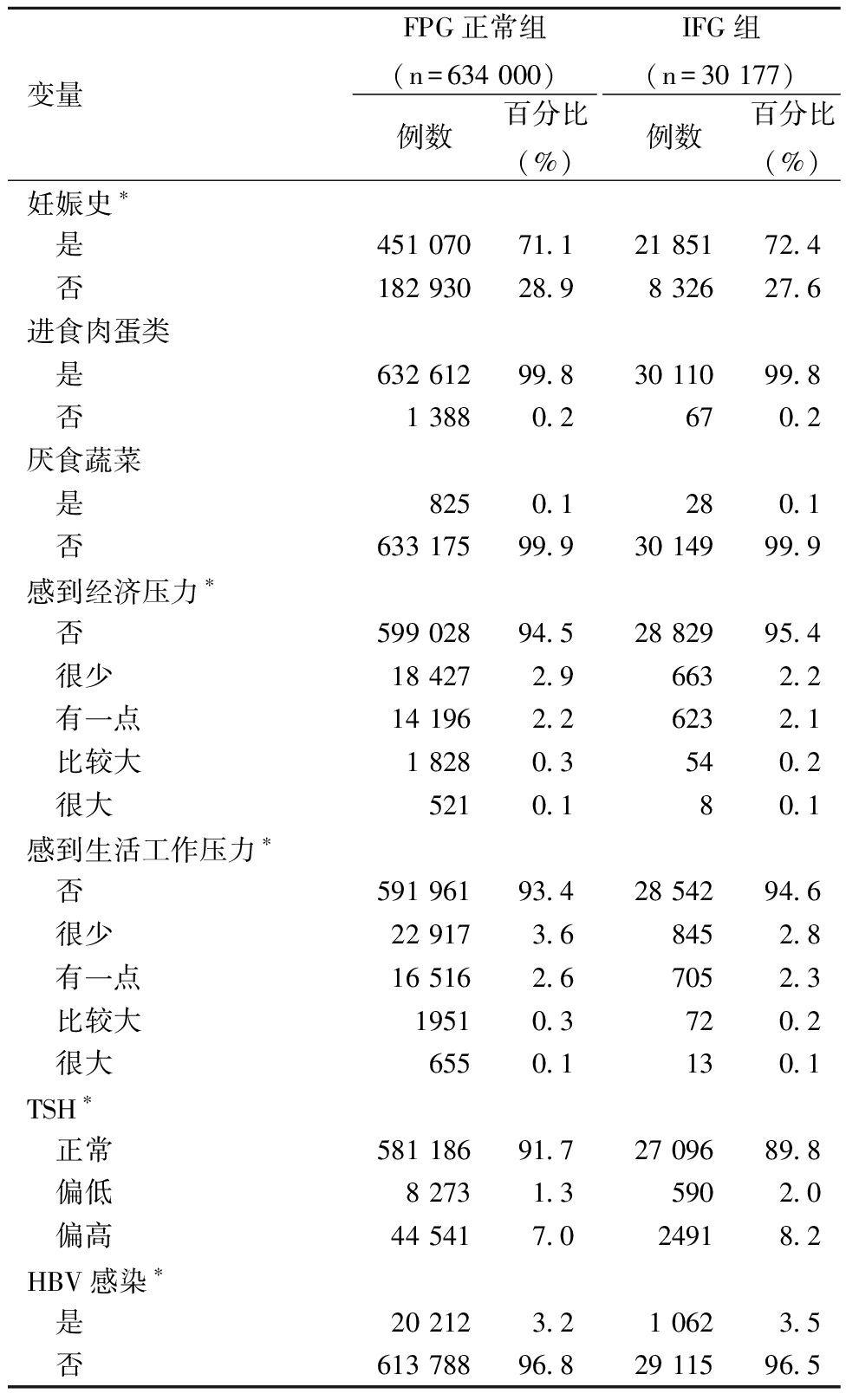 变量FPG正常组(n=634 000)例数百分比(%)IFG组(n=30 177)例数百分比(%)妊娠史∗ 是451 07071.121 85172.4 否182 93028.98 32627.6进食肉蛋类 是632 61299.830 11099.8 否1 3880.2670.2厌食蔬菜 是8250.1280.1 否633 17599.930 14999.9感到经济压力∗ 否599 02894.528 82995.4 很少18 4272.96632.2 有一点14 1962.26232.1 比较大1 8280.3540.2 很大5210.180.1感到生活工作压力∗ 否591 96193.428 54294.6 很少22 9173.68452.8 有一点16 5162.67052.3 比较大19510.3720.2 很大6550.1130.1TSH∗ 正常581 18691.727 09689.8 偏低8 2731.35902.0 偏高44 5417.024918.2HBV感染∗ 是20 2123.21 0623.5 否613 78896.829 11596.5