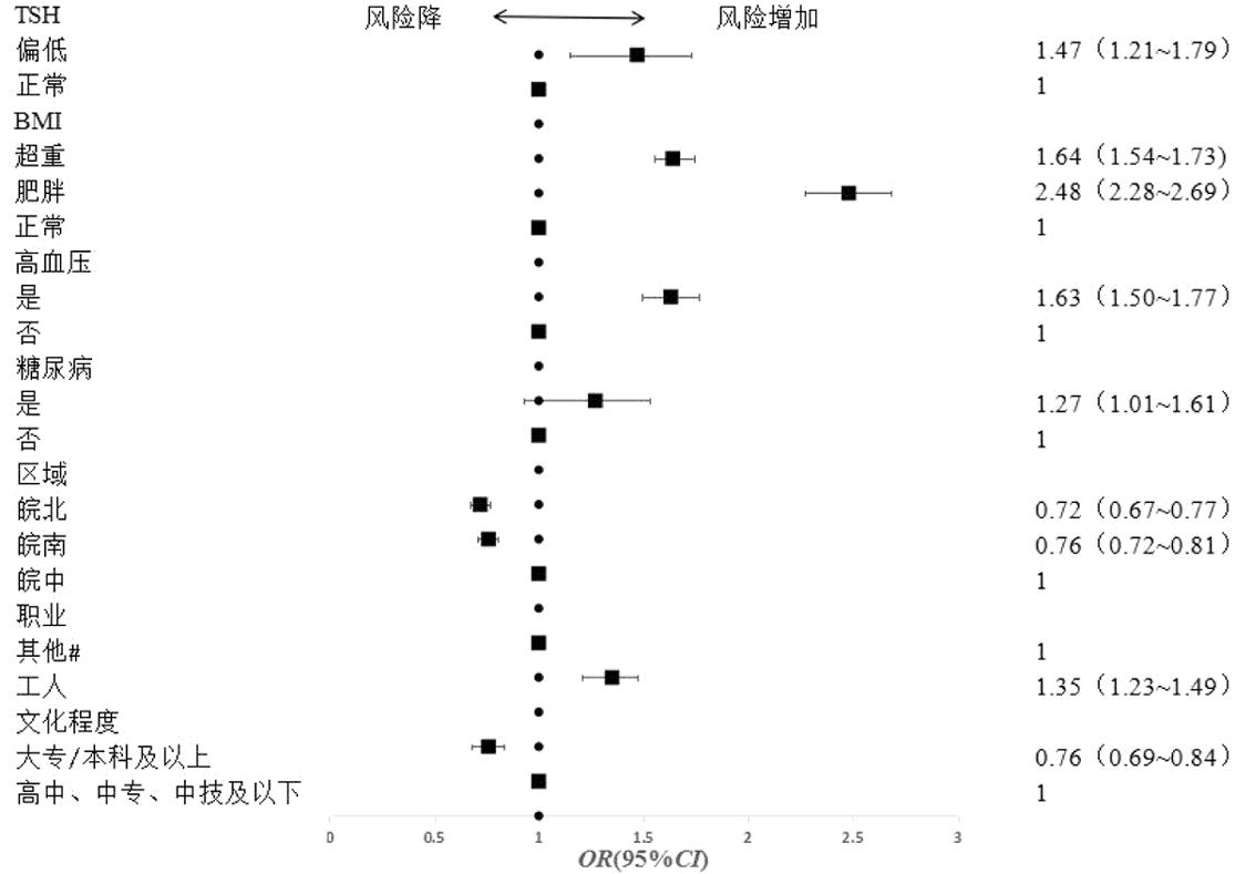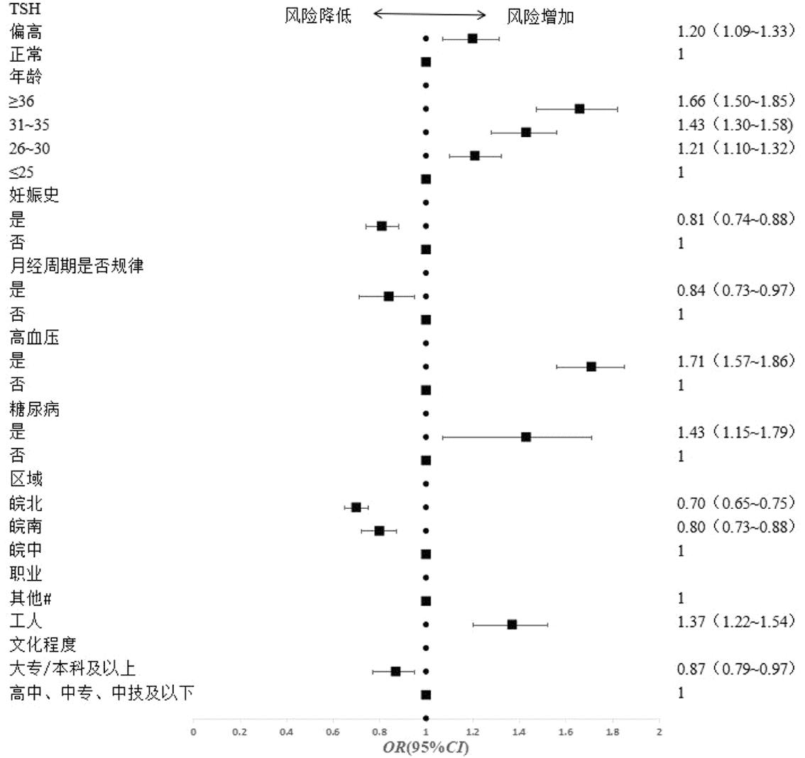 对于肥胖备孕女性,与皖中地区相比,皖南、皖北地区育龄女性IFG发生风险仍旧较低;与≤25岁以下年龄组相比,年龄增加IFG的发生风险升高;相比文化程度为高中、中专、中技及以下,大专/本科及以上文化程度发生风险有所降低;与服务业、经商、家务和自由职业者相比,仅工人发生IFG的风险仍旧升高;糖尿病家族史、高血压增加IFG的发生风险;月经周期规律、有妊娠史的研究对象IFG患病风险有所降低;与TSH水平正常相比,TSH水平偏高发生IFG的风险均升高(图2)。