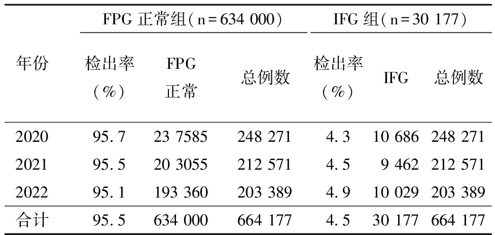 年份FPG正常组(n=634 000)检出率(%)FPG正常总例数IFG组(n=30 177)检出率(%)IFG总例数202095.723 7585248 2714.310 686248 271202195.520 3055212 5714.59 462212 571202295.1193 360203 3894.910 029203 389合计95.5634 000664 1774.530 177664 177