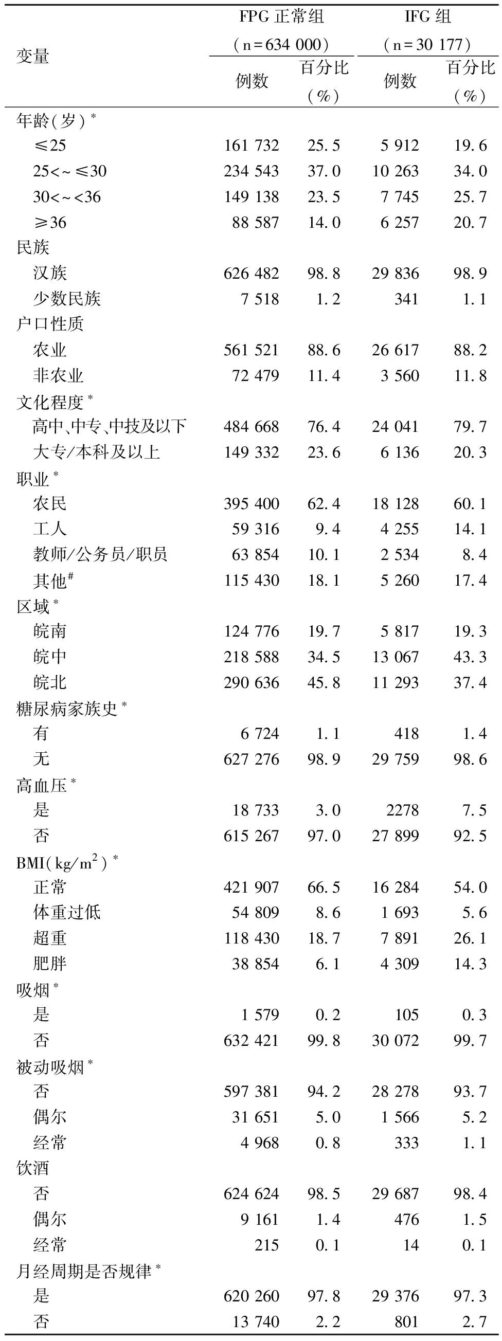 变量FPG正常组(n=634 000)例数百分比(%)IFG组(n=30 177)例数百分比(%)年龄(岁)∗ ≤25161 73225.55 91219.6 25<~≤30234 54337.010 26334.0 30<~<36149 13823.57 74525.7 ≥3688 58714.06 25720.7民族 汉族626 48298.829 83698.9 少数民族7 5181.23411.1户口性质 农业561 52188.626 61788.2 非农业72 47911.43 56011.8文化程度∗ 高中、中专、中技及以下484 66876.424 04179.7 大专/本科及以上149 33223.66 13620.3职业∗ 农民395 40062.418 12860.1 工人59 3169.44 25514.1 教师/公务员/职员63 85410.12 5348.4 其他#115 43018.15 26017.4区域∗ 皖南124 77619.75 81719.3 皖中218 58834.513 06743.3 皖北290 63645.811 29337.4糖尿病家族史∗ 有6 7241.14181.4 无627 27698.929 75998.6高血压∗ 是18 7333.022787.5 否615 26797.027 89992.5BMI(kg/m2)∗ 正常421 90766.516 28454.0 体重过低54 8098.61 6935.6 超重118 43018.77 89126.1 肥胖38 8546.14 30914.3吸烟∗ 是1 5790.21050.3 否632 42199.830 07299.7被动吸烟∗ 否597 38194.228 27893.7 偶尔31 6515.01 5665.2 经常4 9680.83331.1饮酒 否624 62498.529 68798.4 偶尔9 1611.44761.5 经常2150.1140.1月经周期是否规律∗ 是620 26097.829 37697.3 否13 7402.28012.7