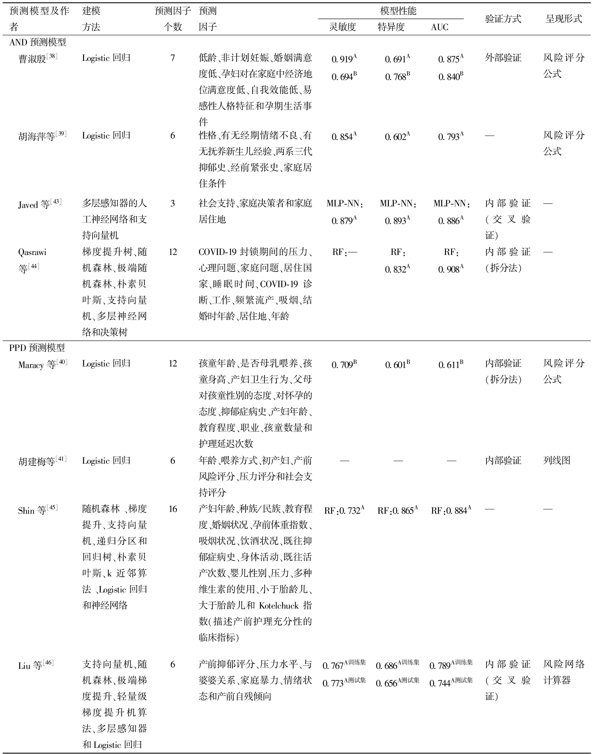 预测模型及作者建模方法预测因子个数预测因子模型性能灵敏度特异度AUC验证方式呈现形式AND预测模型 曹淑殷[38]Logistic回归7低龄、非计划妊娠、婚姻满意度低、孕妇对在家庭中经济地位满意度低、自我效能低、易感性人格特征和孕期生活事件0.919A0.694B0.691 A0.768 B0.875 A0.840 B外部验证风险评分公式 胡海萍等[39]Logistic回归6性格、有无经期情绪不良、有无抚养新生儿经验、两系三代抑郁史、经前紧张史、家庭居住条件0.854 A0.602 A0.793 A—风险评分公式 Javed等[43]多层感知器的人工神经网络和支持向量机3社会支持、家庭决策者和家庭居住地MLP-NN:0.879 AMLP-NN:0.893 AMLP-NN:0.886 A内部验证(交叉验证)— Qasrawi 等[44]梯度提升树、随机森林、极端随机森林、朴素贝叶斯、支持向量机、多层神经网络和决策树12COVID-19 封锁期间的压力、 心理问题、家庭问题、居住国家、睡眠时间、COVID-19 诊断、工作、频繁流产、吸烟、结婚时年龄、居住地、年龄RF:—RF:0.832 ARF:0.908 A内部验证(拆分法)—PPD预测模型 Maracy等[40]Logistic回归12孩童年龄、是否母乳喂养、孩童身高、产妇卫生行为、父母对孩童性别的态度、对怀孕的态度、抑郁症病史、产妇年龄、教育程度、职业、孩童数量和护理延迟次数0.709B0.601B0.611B内部验证(拆分法)风险评分公式 胡建梅等[41]Logistic回归6年龄、喂养方式、初产妇、产前风险评分、压力评分和社会支持评分———内部验证列线图 Shin等[45]随机森林 、梯度提升、支持向量机、递归分区和回归树、朴素贝叶斯、k近邻算法 、Logistic回归和神经网络16产妇年龄、种族/民族、教育程度、婚姻状况、孕前体重指数、吸烟状况、饮酒状况、既往抑郁症病史、身体活动、既往活产次数、婴儿性别、压力、多种维生素的使用、小于胎龄儿、大于胎龄儿和 Kotelchuck 指数(描述产前护理充分性的临床指标)RF:0.732 ARF:0.865 ARF:0.884 A—— Liu等[46]支持向量机、随机森林、极端梯度提升、轻量级梯度提升机算法、多层感知器和Logistic回归6产前抑郁评分、压力水平、与婆婆关系、家庭暴力、情绪状态和产前自残倾向0.767A训练集0.773 A测试集0.686 A训练集0.656 A测试集0.789 A训练集0.744 A测试集内部验证(交叉验证)风险网络计算器